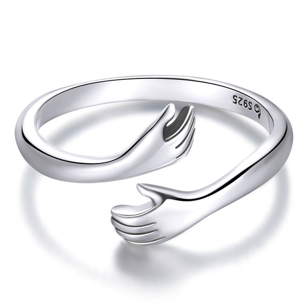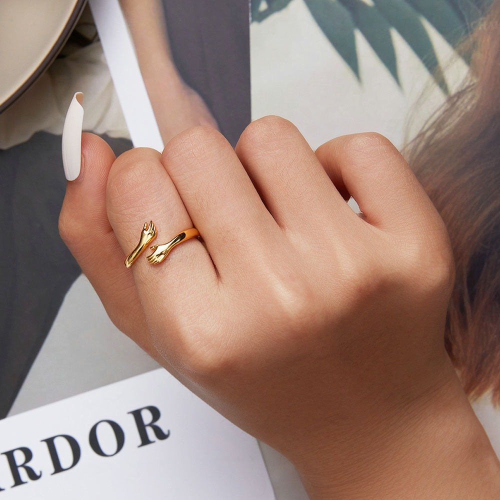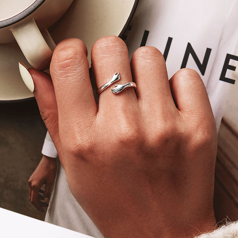 Siente el calor de un abrazo eterno con este anillo. Esta pieza única representa dos manos estrechando delicadamente su dedo a imagen de un abrazo eterno. Más que un anillo, es un símbolo de consuelo y amor que puedes llevar todos los días.